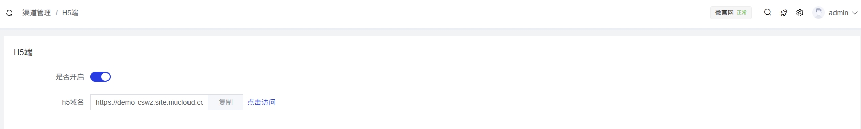开启状态:开关显示为蓝色,此时用户可以通过H5域名访问系统的H5版本。
