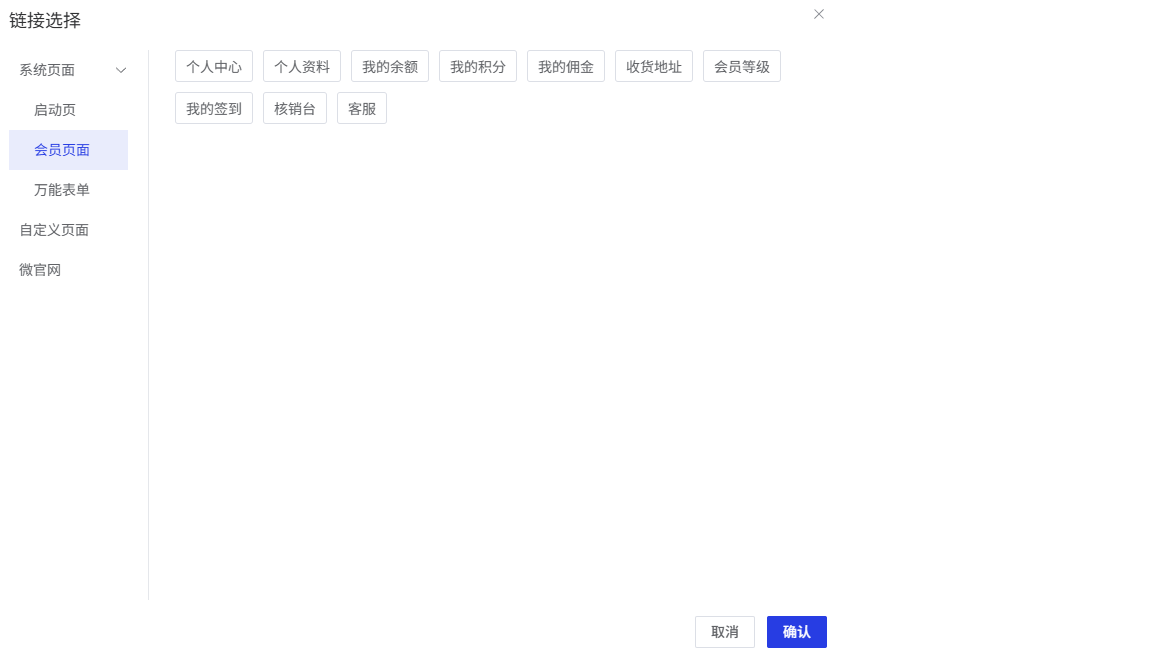选择"会员页面"后,可以将启动页链接到会员相关的功能页面,包括: