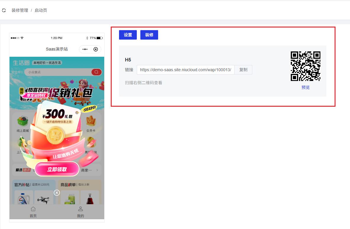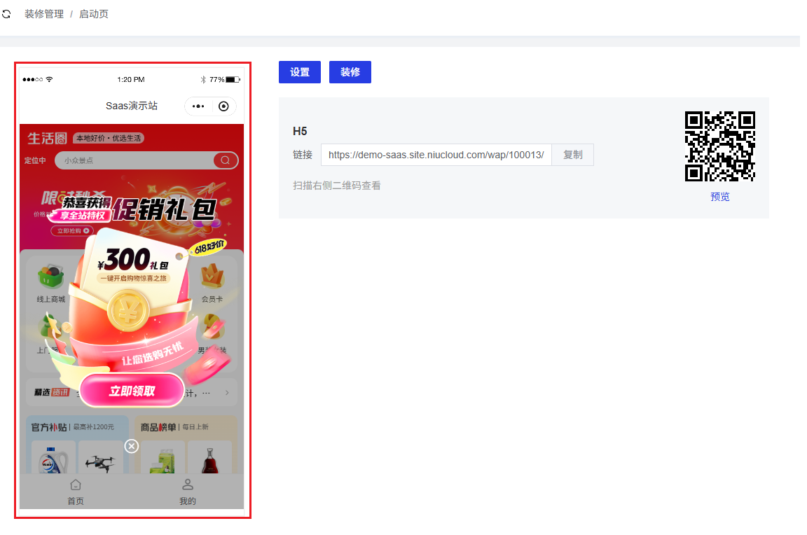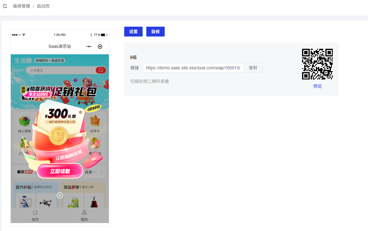 H5链接:显示当前启动页的访问链接,支持复制功能。