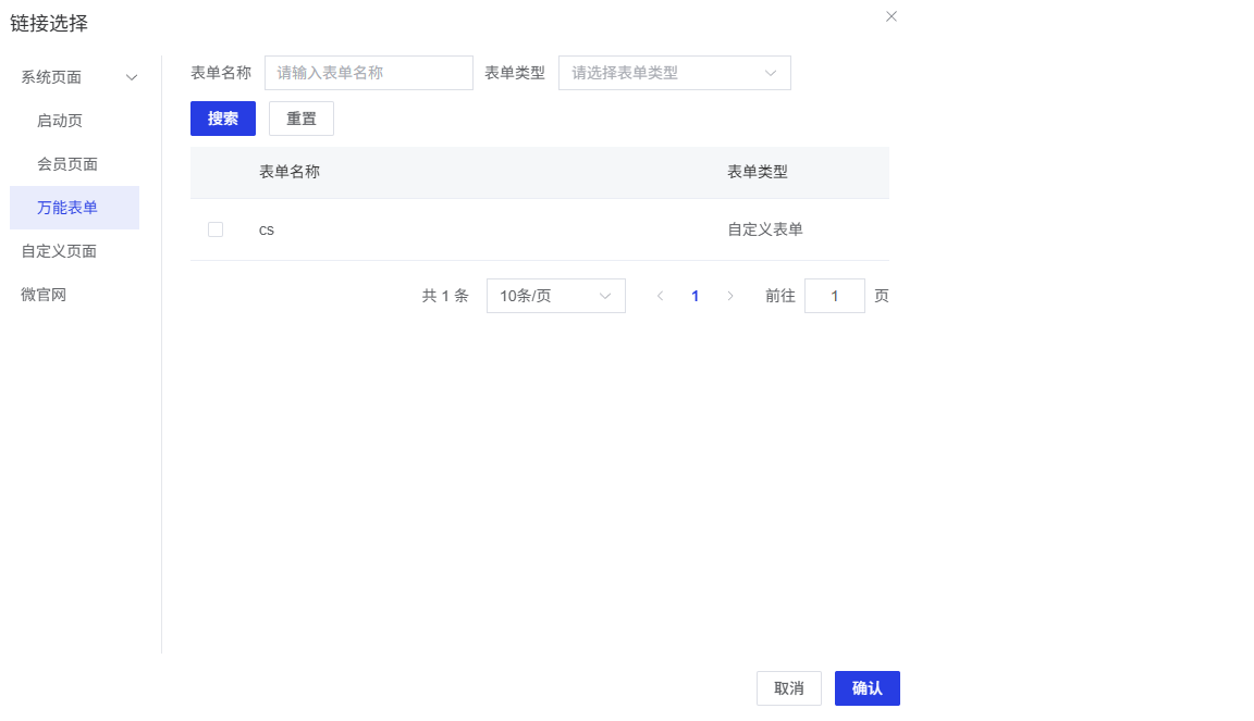 选择"万能表单"后,可以将启动页链接到已创建的万能表单页面。该界面提供表单搜索功能,支持按表单名称和表单类型进行筛选查找。