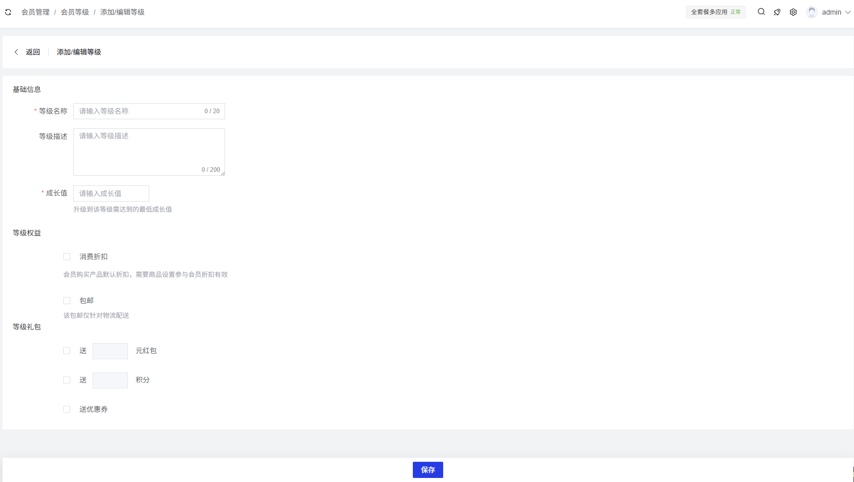 等级名称:输入等级的名称(必填,最多20个字符)。