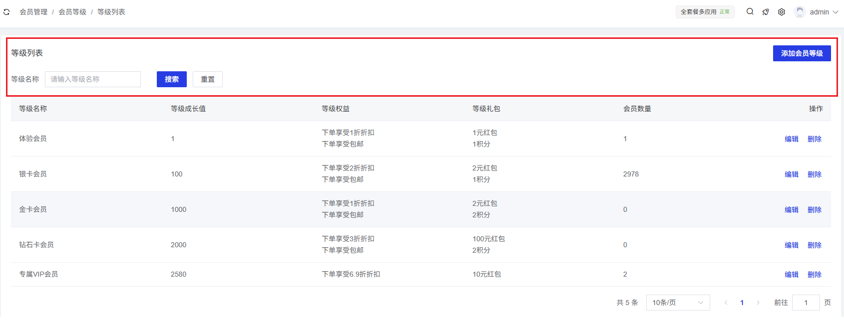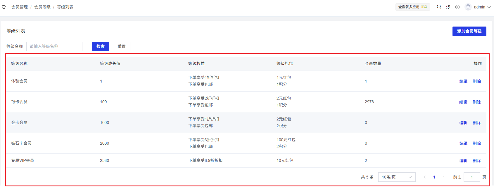 等级列表是会员等级管理的核心页面,用于展示、添加、编辑和删除会员等级,配置不同等级的成长值要求、等级权益和等级礼包,实现会员分层管理和激励机制。