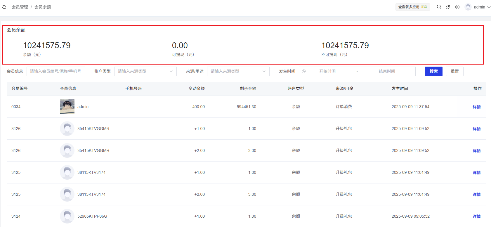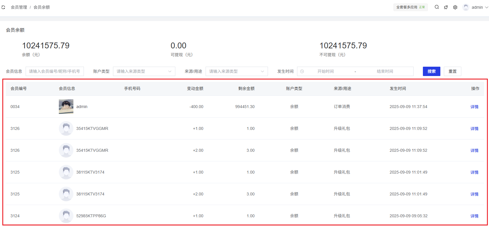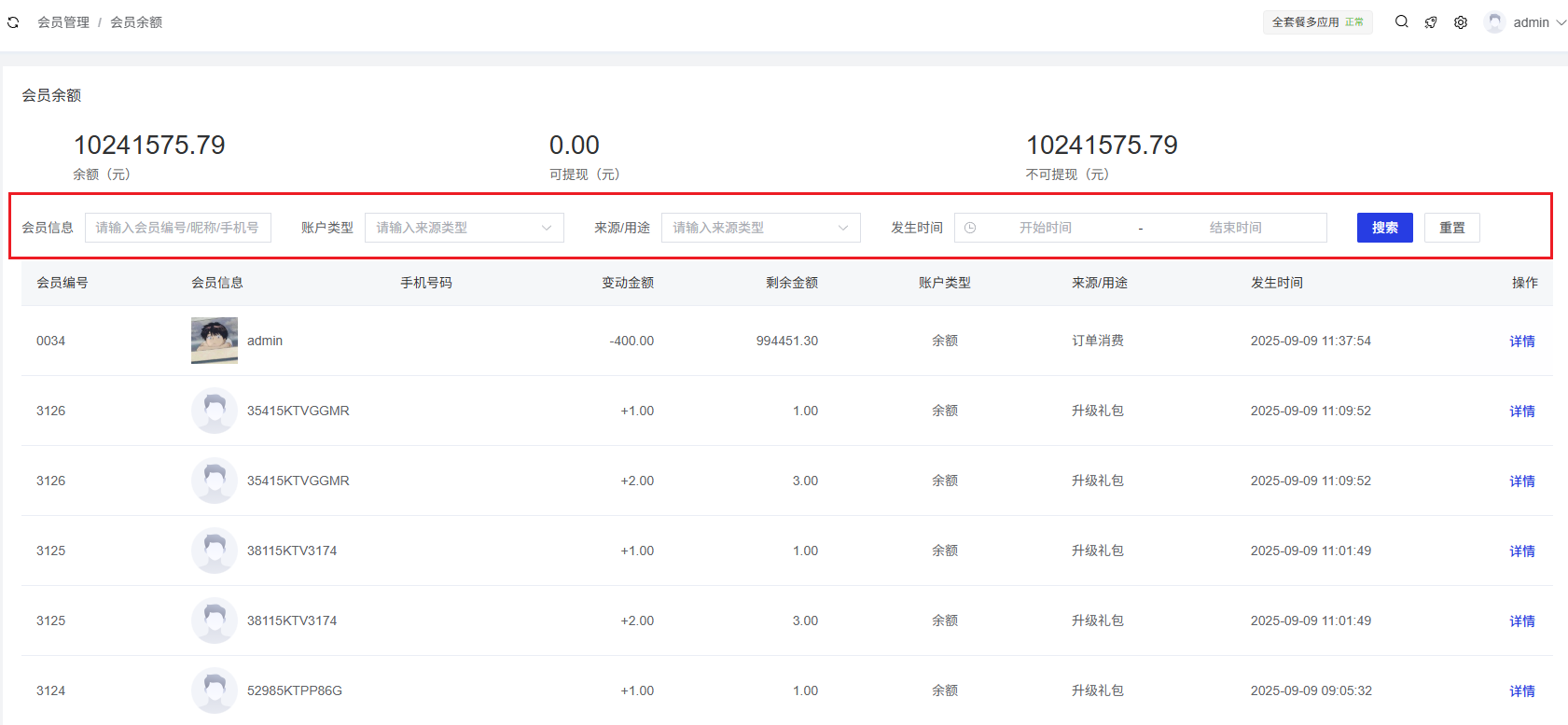 会员信息:通过会员编号或手机号码搜索特定会员的余额记录。