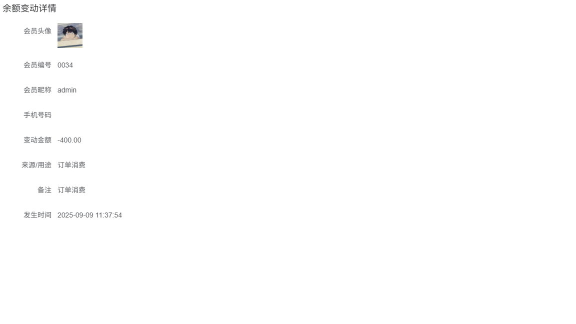 以表格形式展示会员余额变动的详细记录,包含以下列: