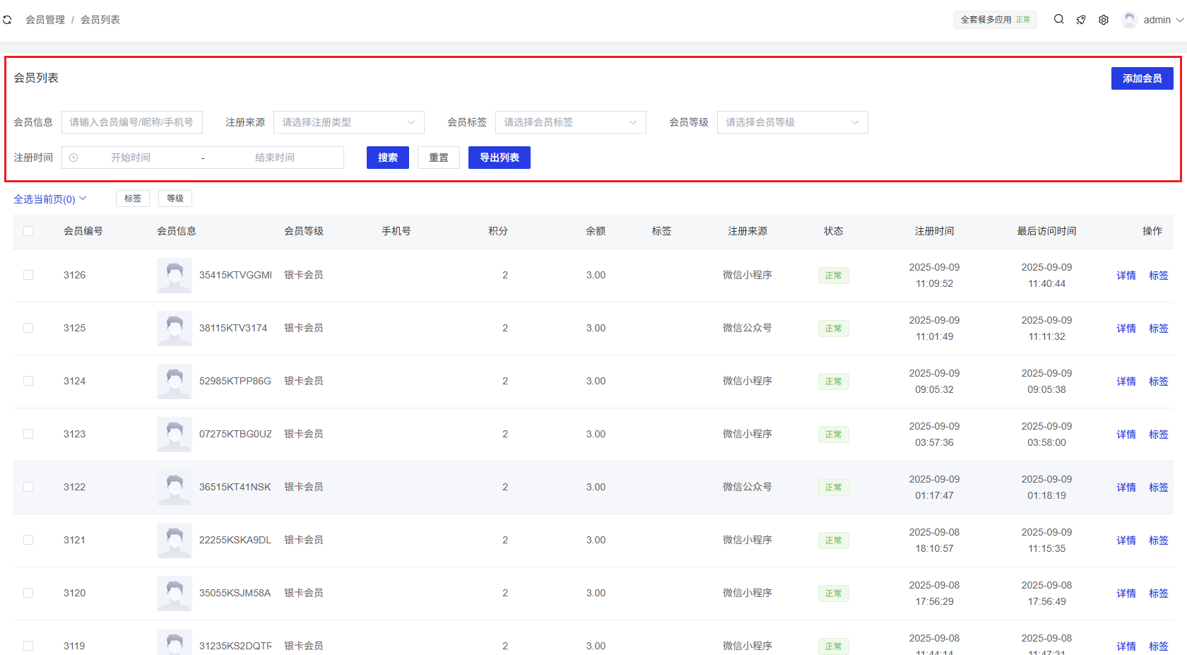 手机号:显示会员绑定的手机号。