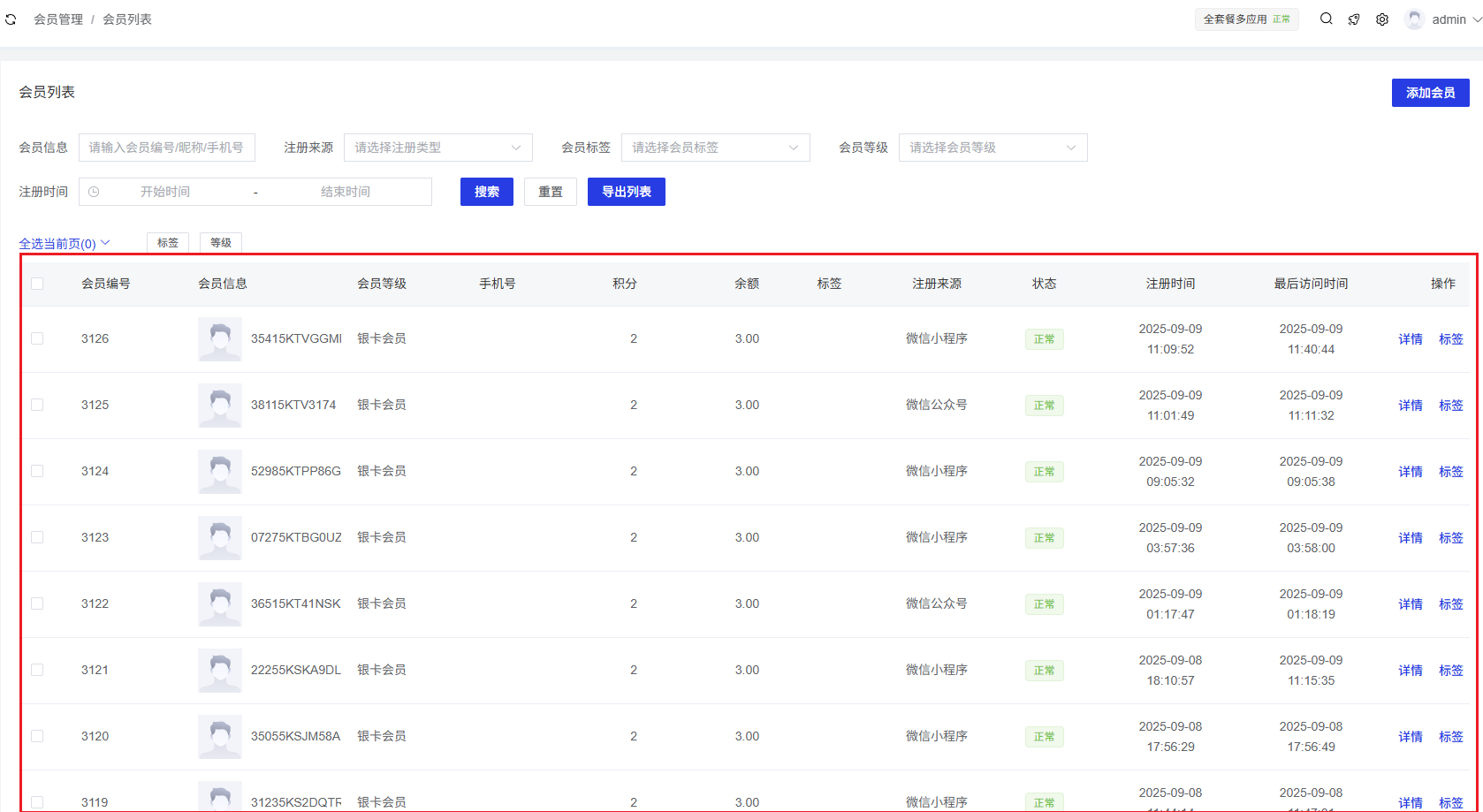 会员列表页面包含以下主要功能区域: