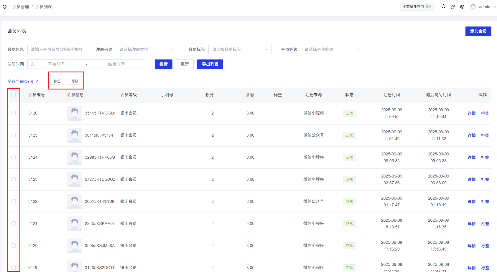 标签按钮:点击后可打开批量设置会员标签的弹窗。