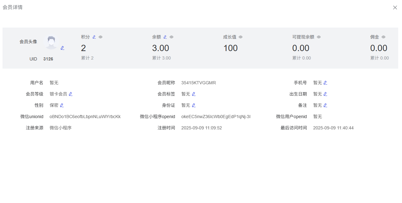 基础信息:会员头像、UID、用户名、会员昵称、手机号、会员等级、会员身份、性别、生日、微信unionid、微信小程序openid、微信公众号openid、注册来源、注册时间、最后访问时间等。