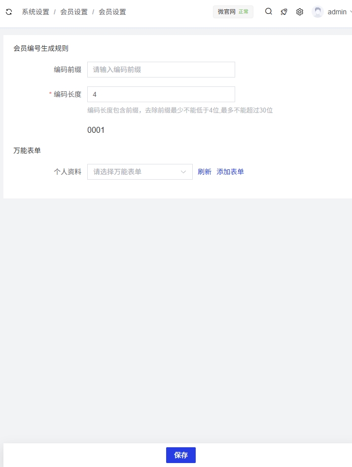 会员设置页面用于配置会员编号生成规则和个人资料表单的关联设置,帮助管理员统一管理会员基础信息。