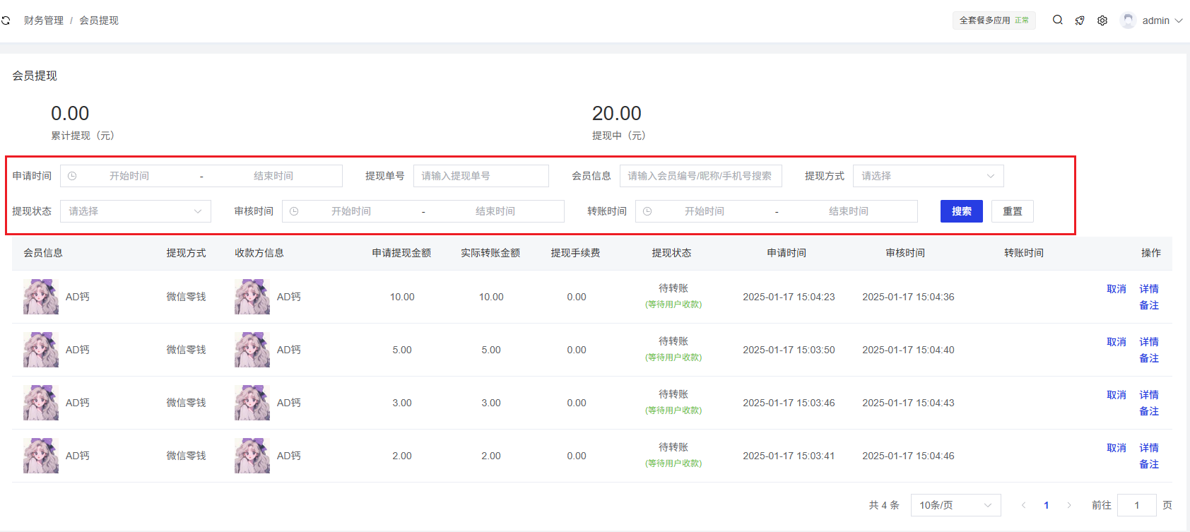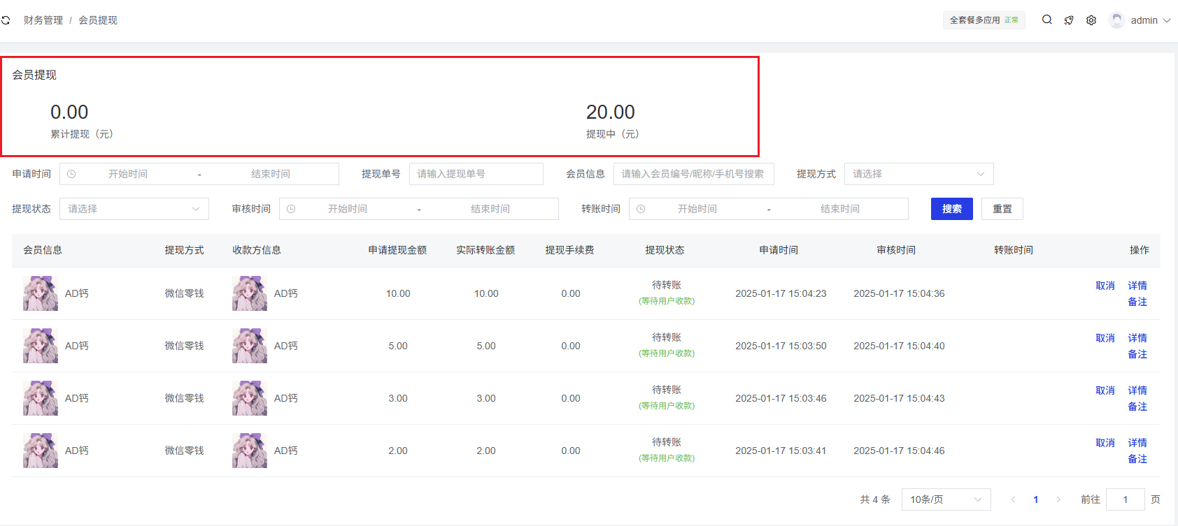 会员提现功能用于处理会员的提现申请,支持提现方式管理、申请审核、提现状态跟踪等操作,帮助用户高效管理会员的资金提现流程。
