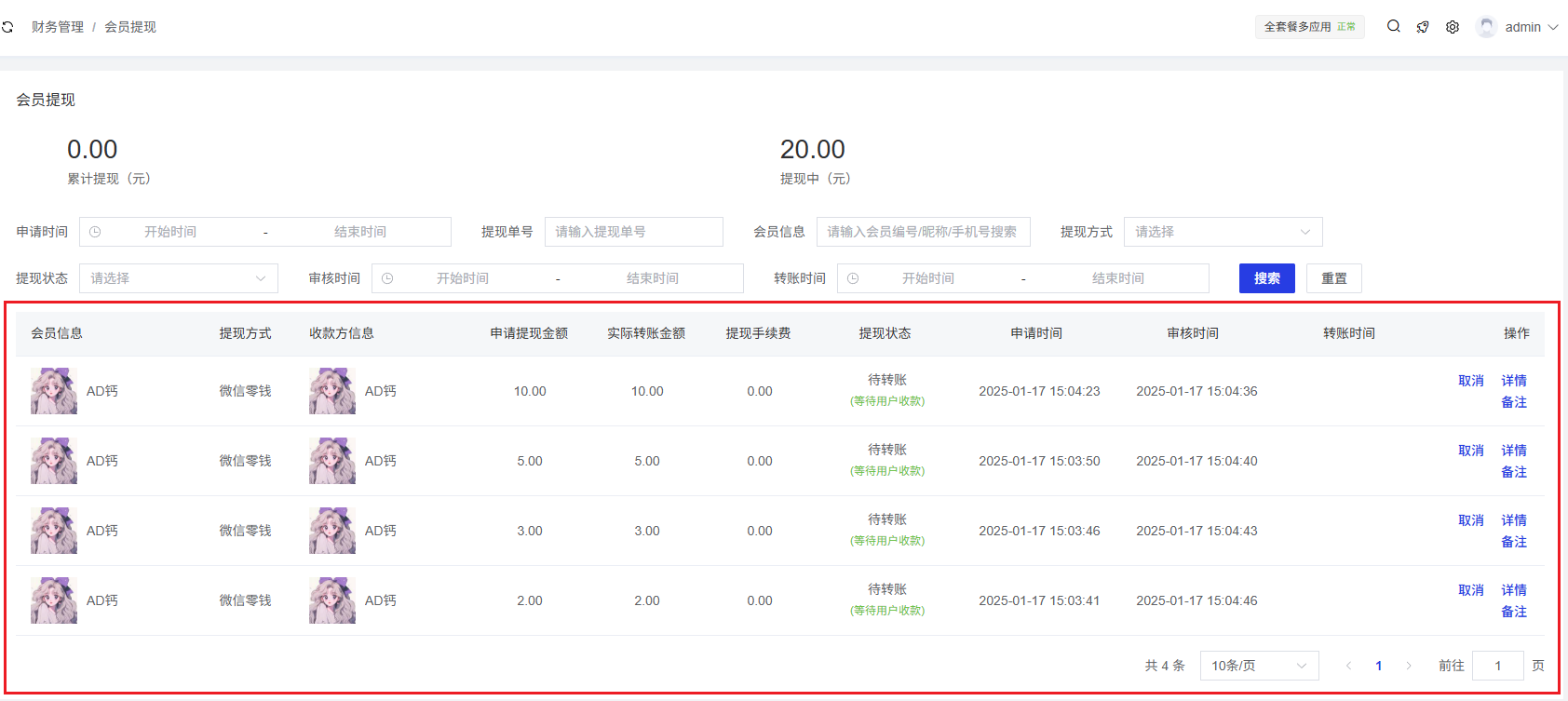 申请时间:显示会员提交提现申请的具体日期和时间。