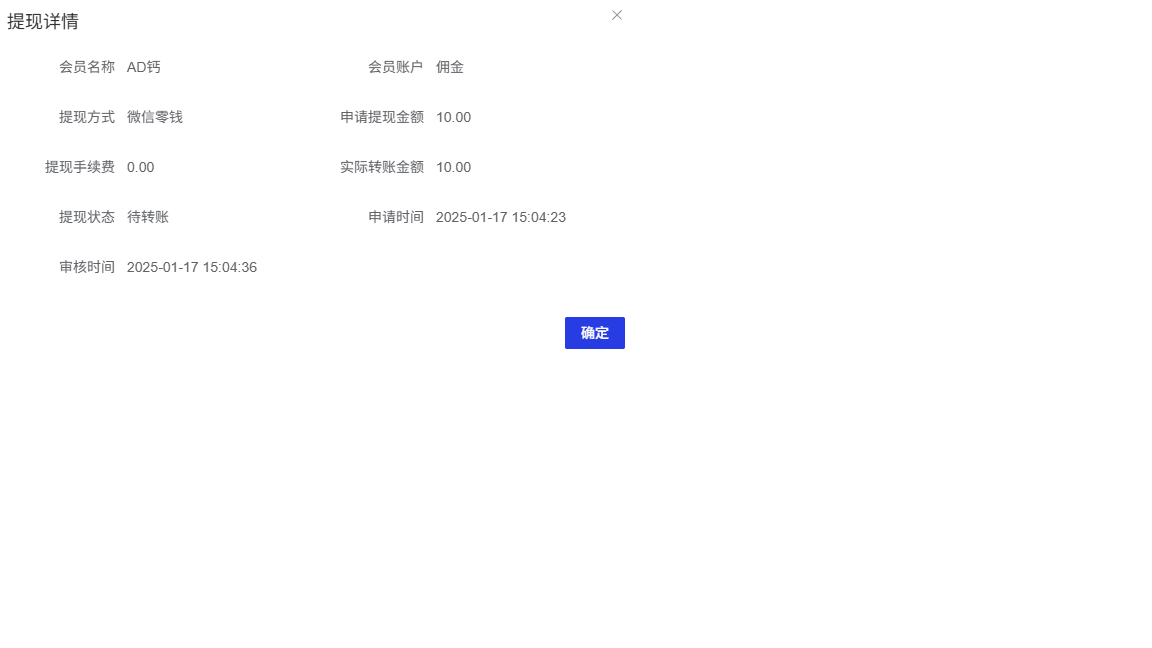 点击提现列表中的"详情"按钮,会弹出提现详情弹窗,展示该笔提现的完整信息,包括: