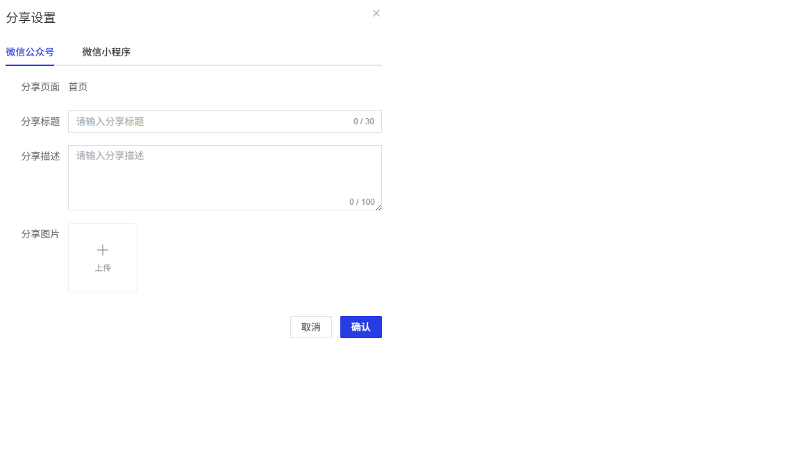 点击页面列表中的"分享"按钮后,将弹出分享设置弹窗,支持设置微信公众号和微信小程序的分享信息。