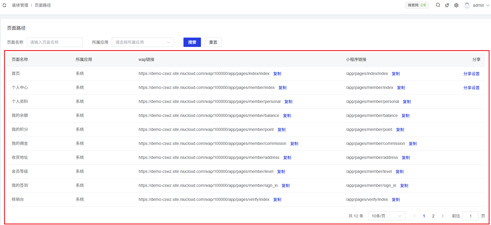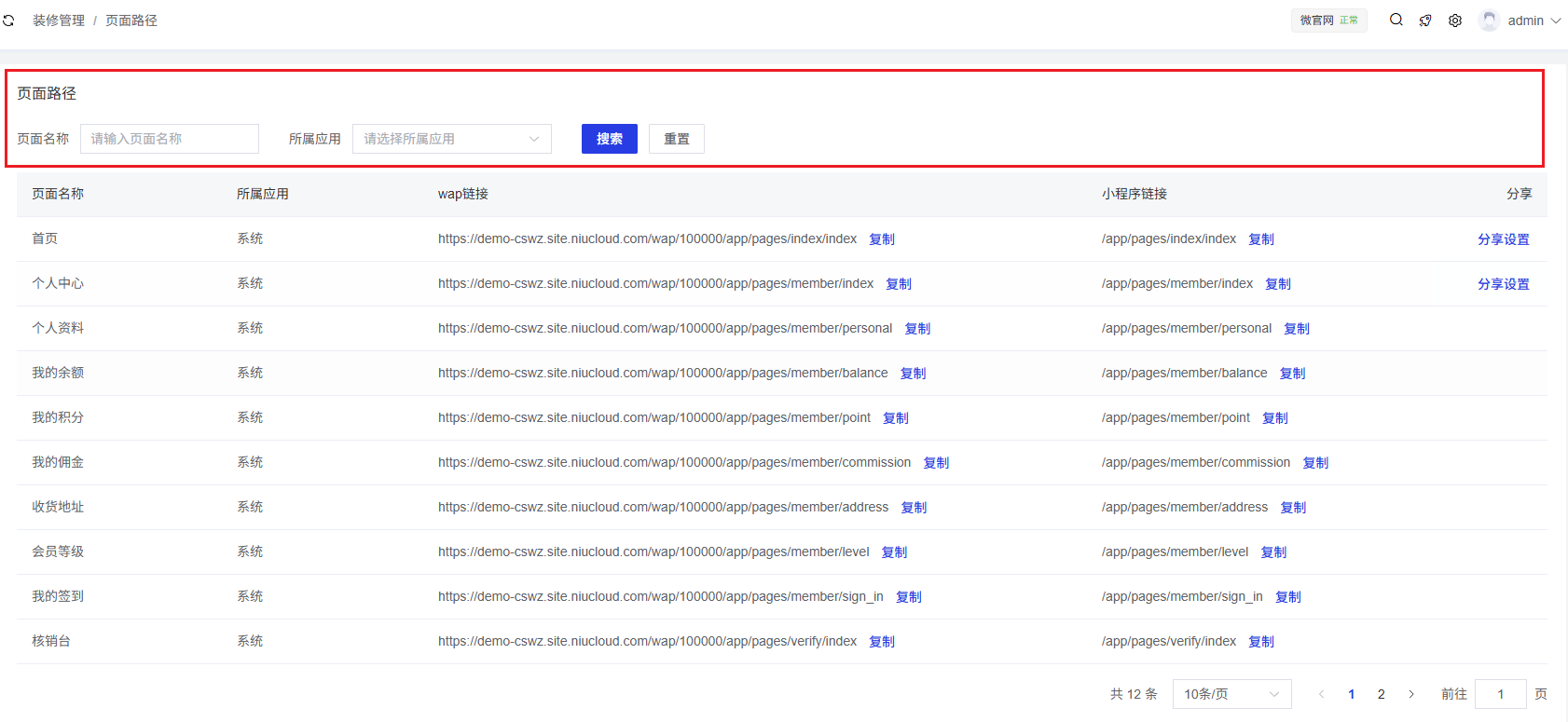 页面路径是展示系统中所有页面的URL链接和小程序链接的功能模块,方便用户查看和复制各页面的访问路径,同时支持对页面进行分享设置。