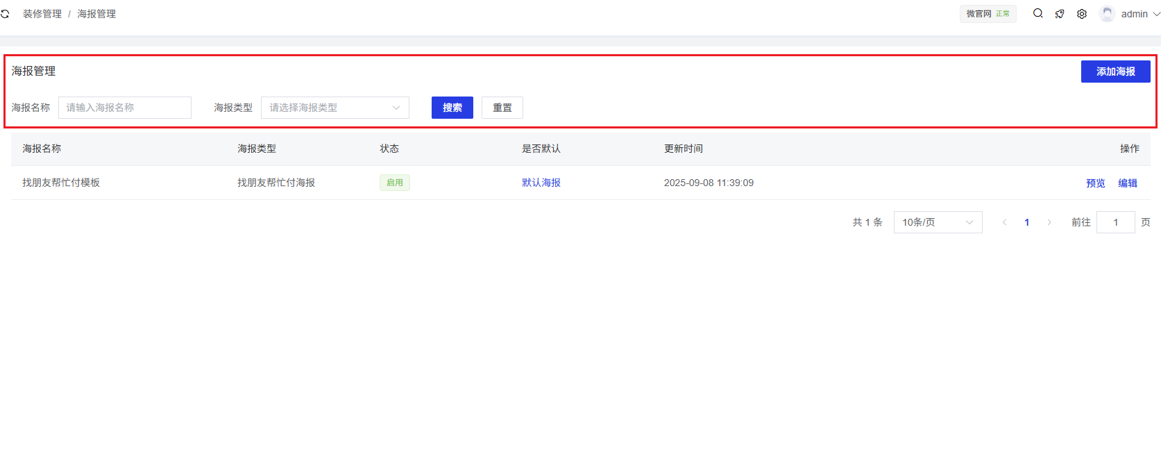 海报管理是用于创建和管理系统中各类海报模板的功能模块,支持自定义海报内容、样式和配置,方便用户生成并分享各类营销和业务场景的海报。