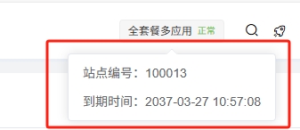 顶部导航栏显示当前站点的名称状态(如"全套餐多应用"“正常”),标识站点的名称和运行状态。当鼠标悬停时,会显示站点的详细信息浮窗,包含:
