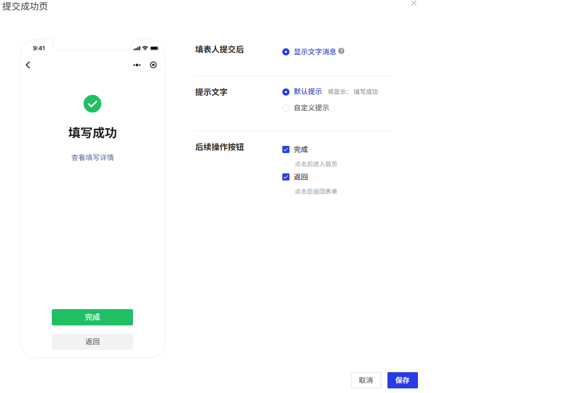 返回按钮:勾选后显示"返回"按钮,点击后返回表单。