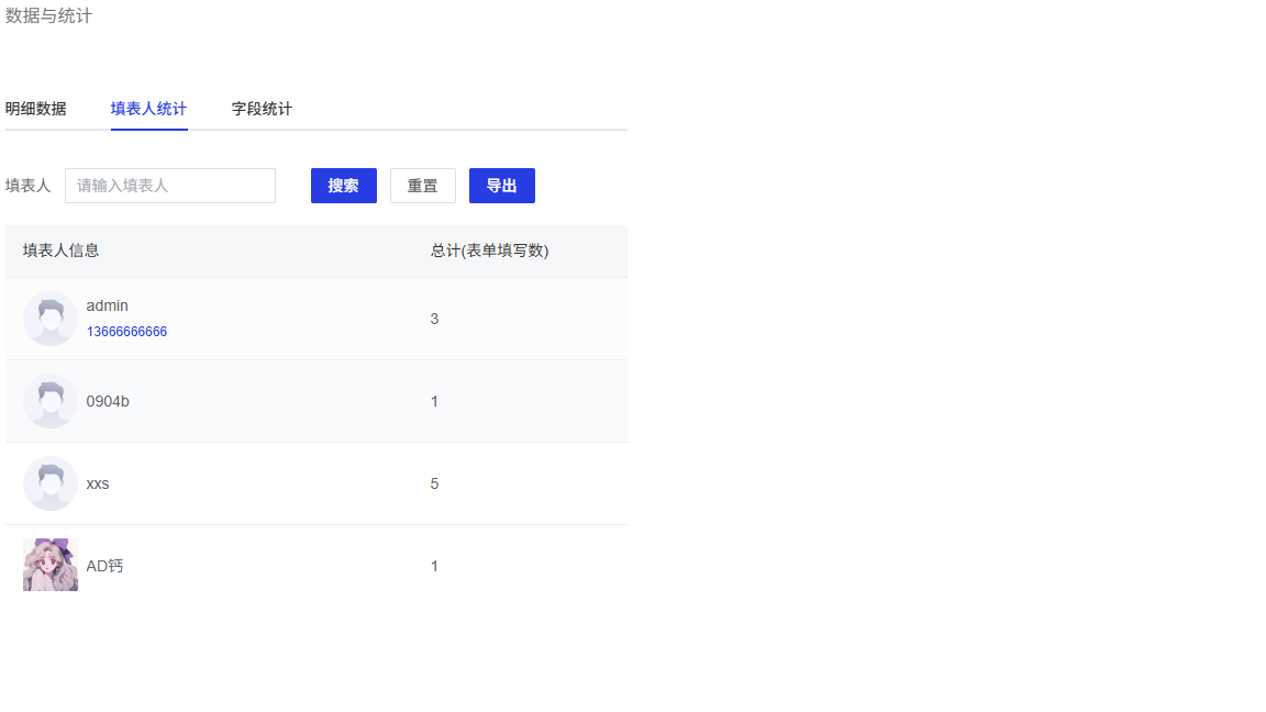 在表单列表中,点击目标表单右侧的"详情"按钮,可查看表单的数据与统计信息。数据与统计模块包含以下子功能: