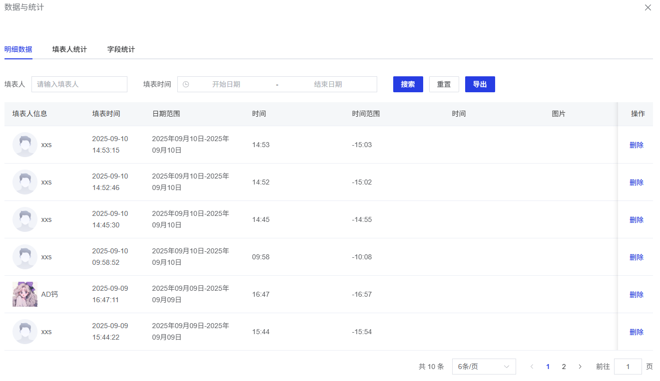 搜索功能:可根据填表人、填表时间范围进行搜索。