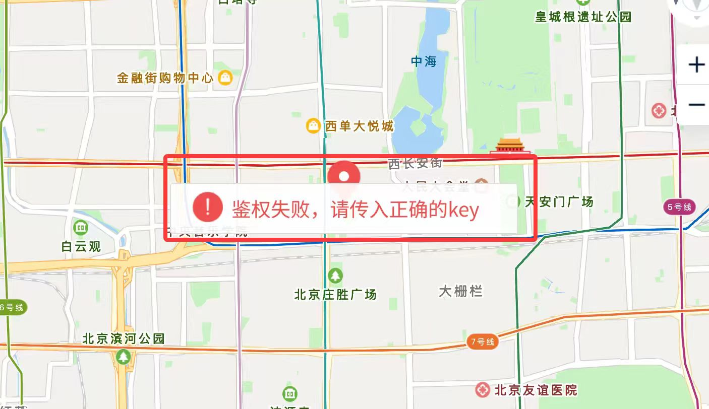 很多伙伴配置地图时会有“鉴权失败,请传入正确的 key ”或“please check the key and referer,try again”的错误提示。如下图: