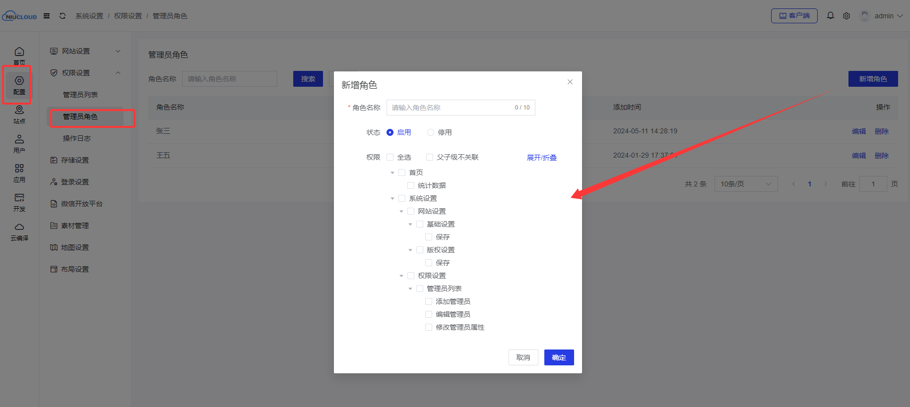 站点端,在权限管理—>管理员角色中控制菜单权限