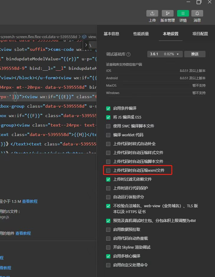 取消勾选“上传代码时自动压缩wxml文件”