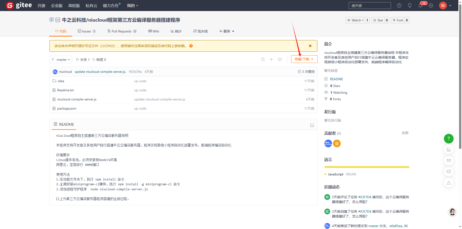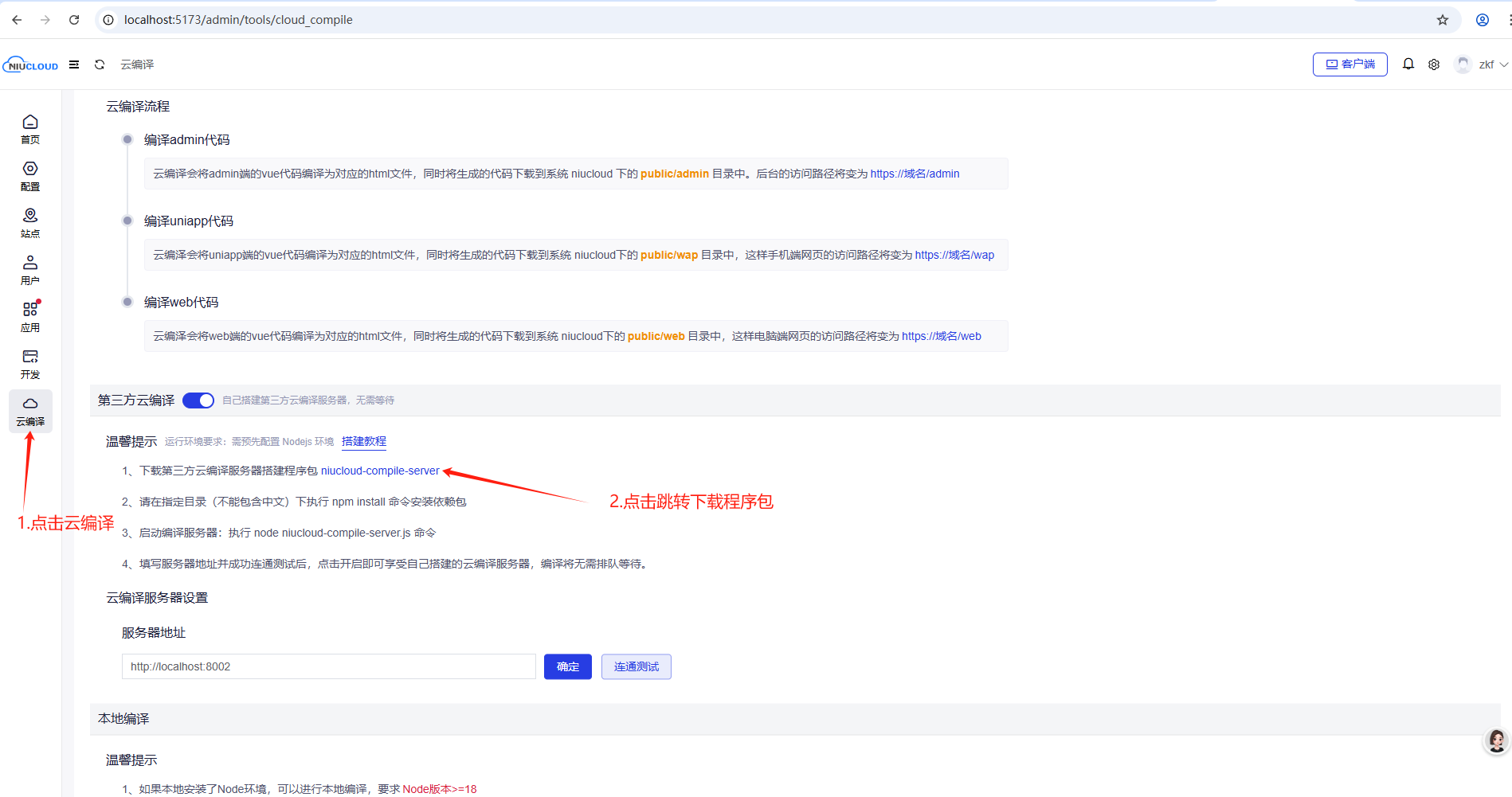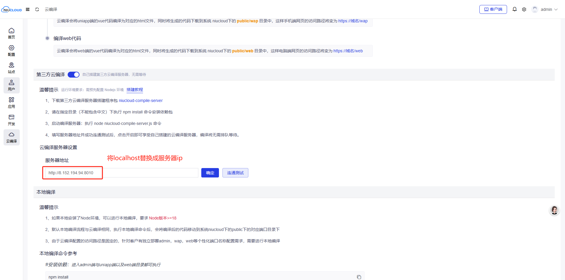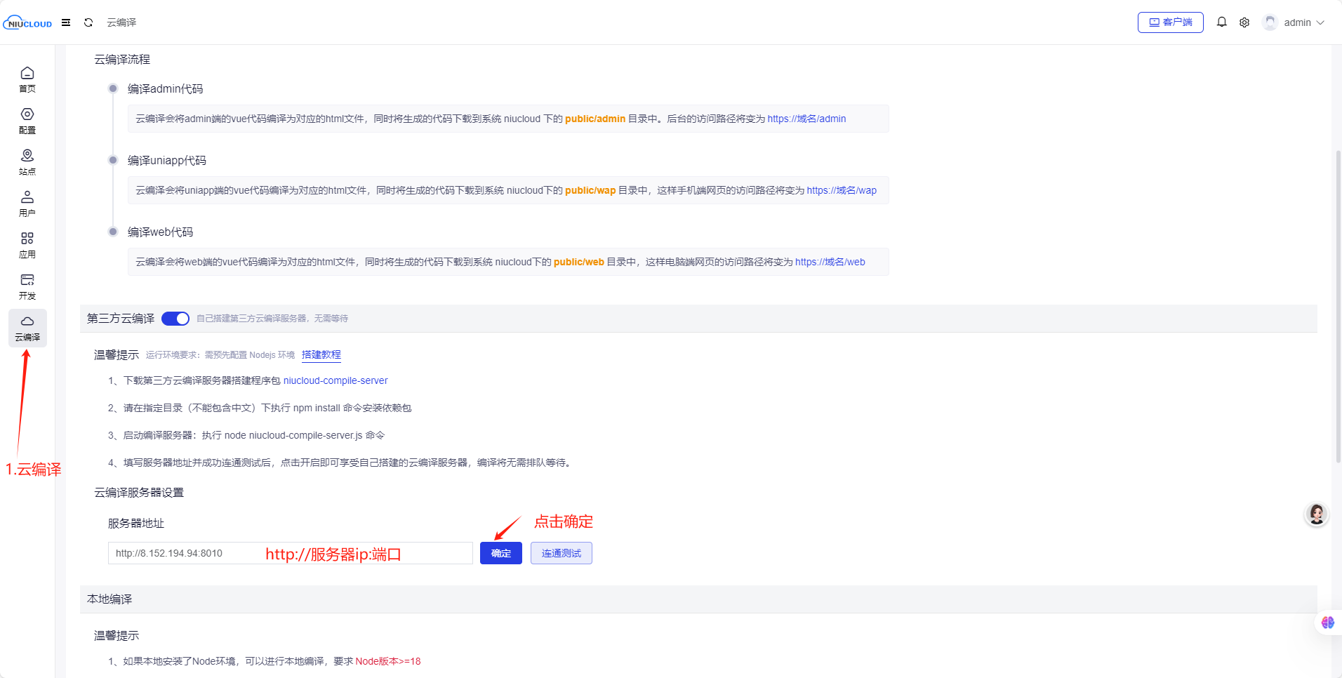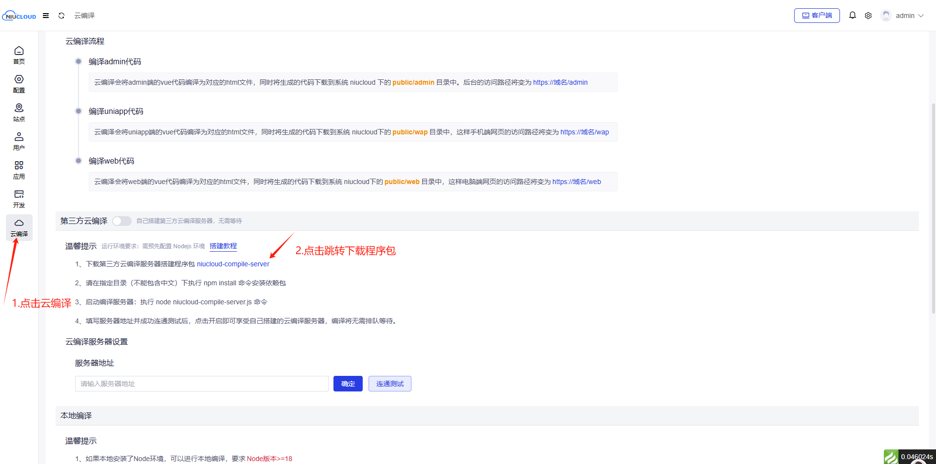 1.打开admin后台、点击云编译菜单,点击niucloud-compile-server,跳转到gitee