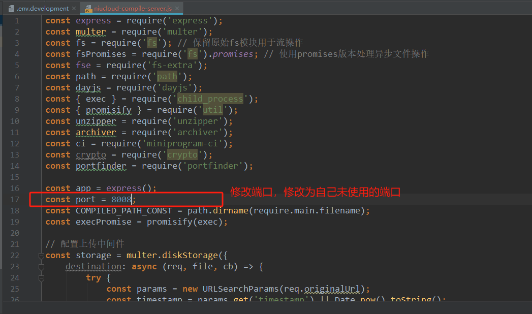 端口修改为自己本地开发未使用的端口,ctrl+s保存,重新运行node niucloud-compile-server.js即可