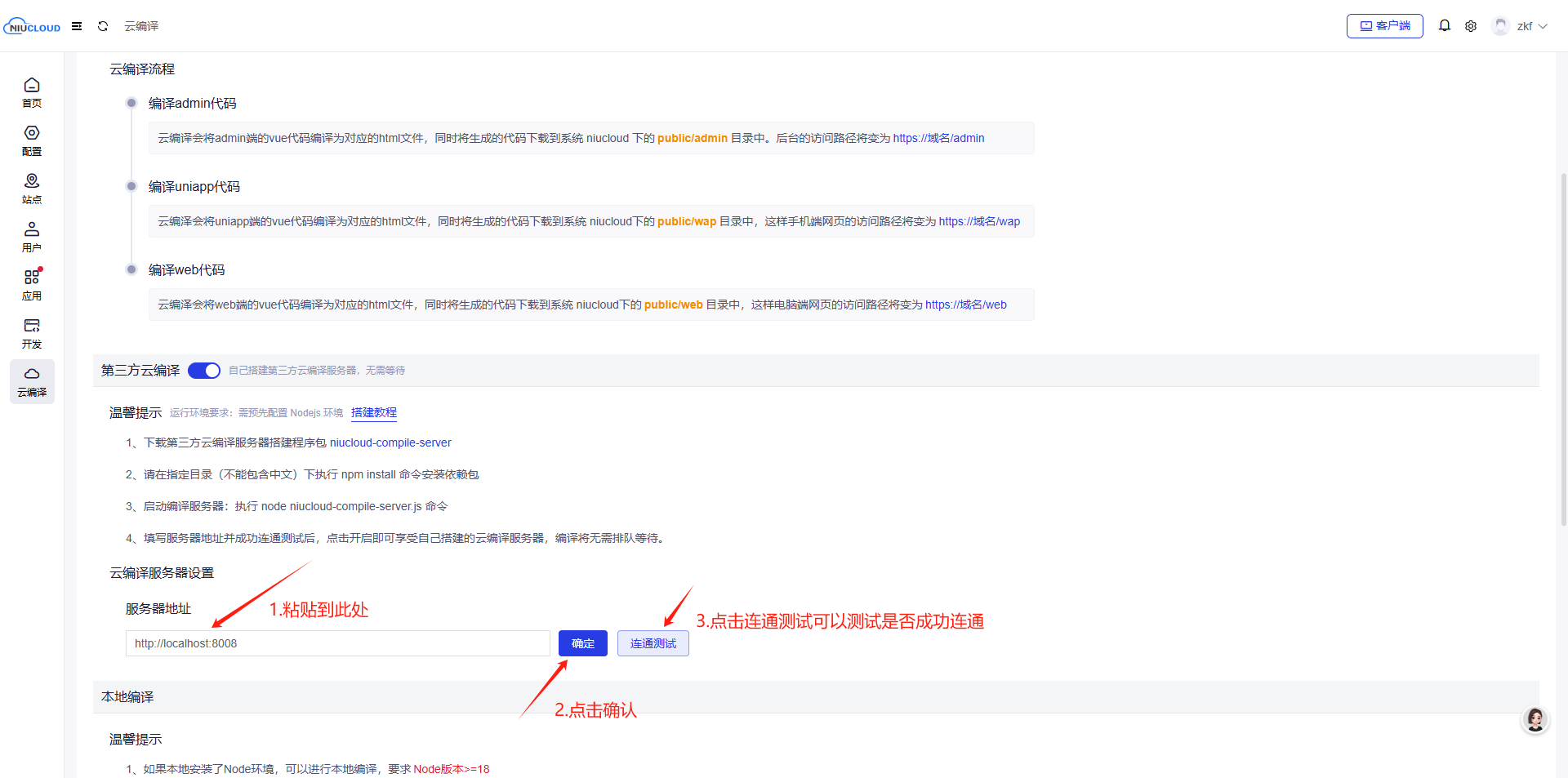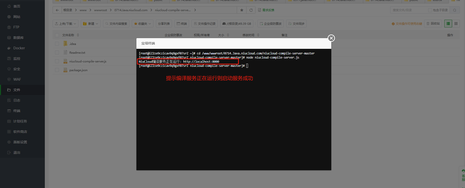 7.出现niucloud编译服务正在运行,则表示云编译服务已启动,复制服务器地址到后台