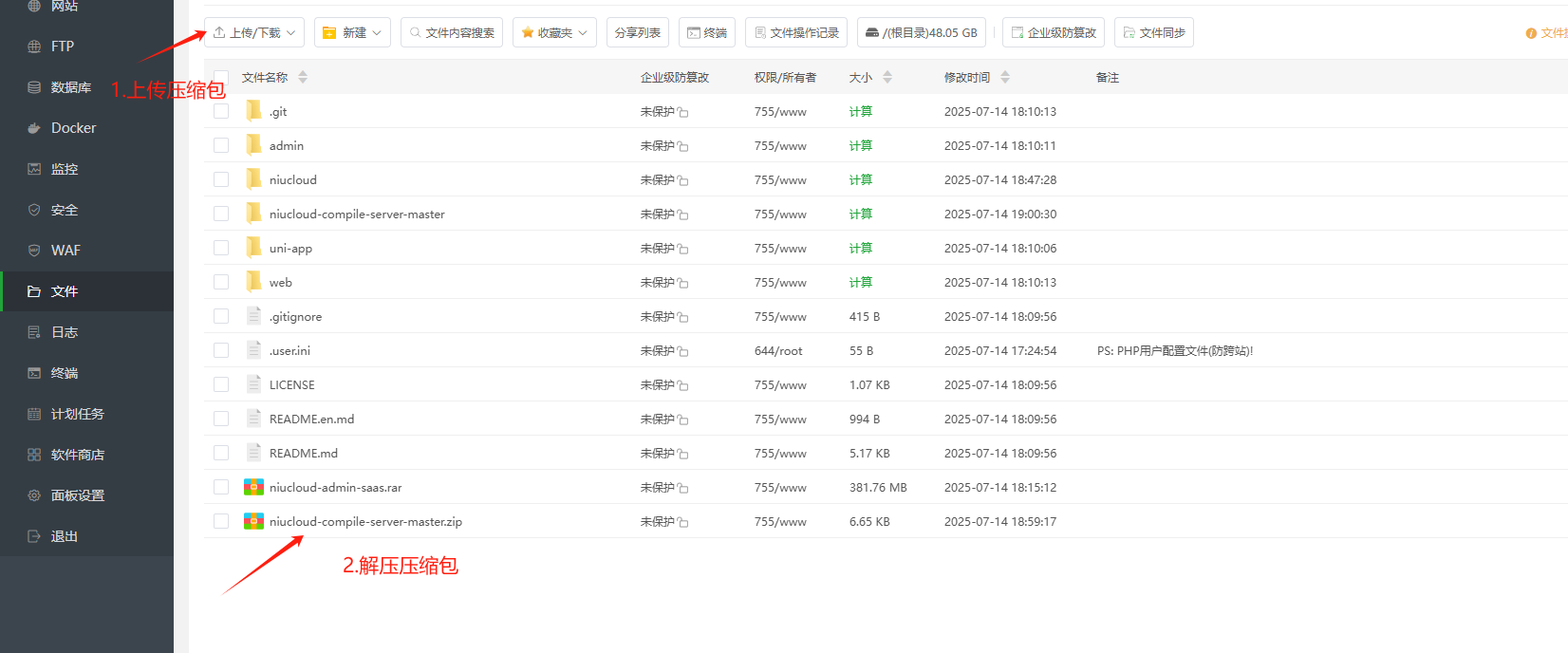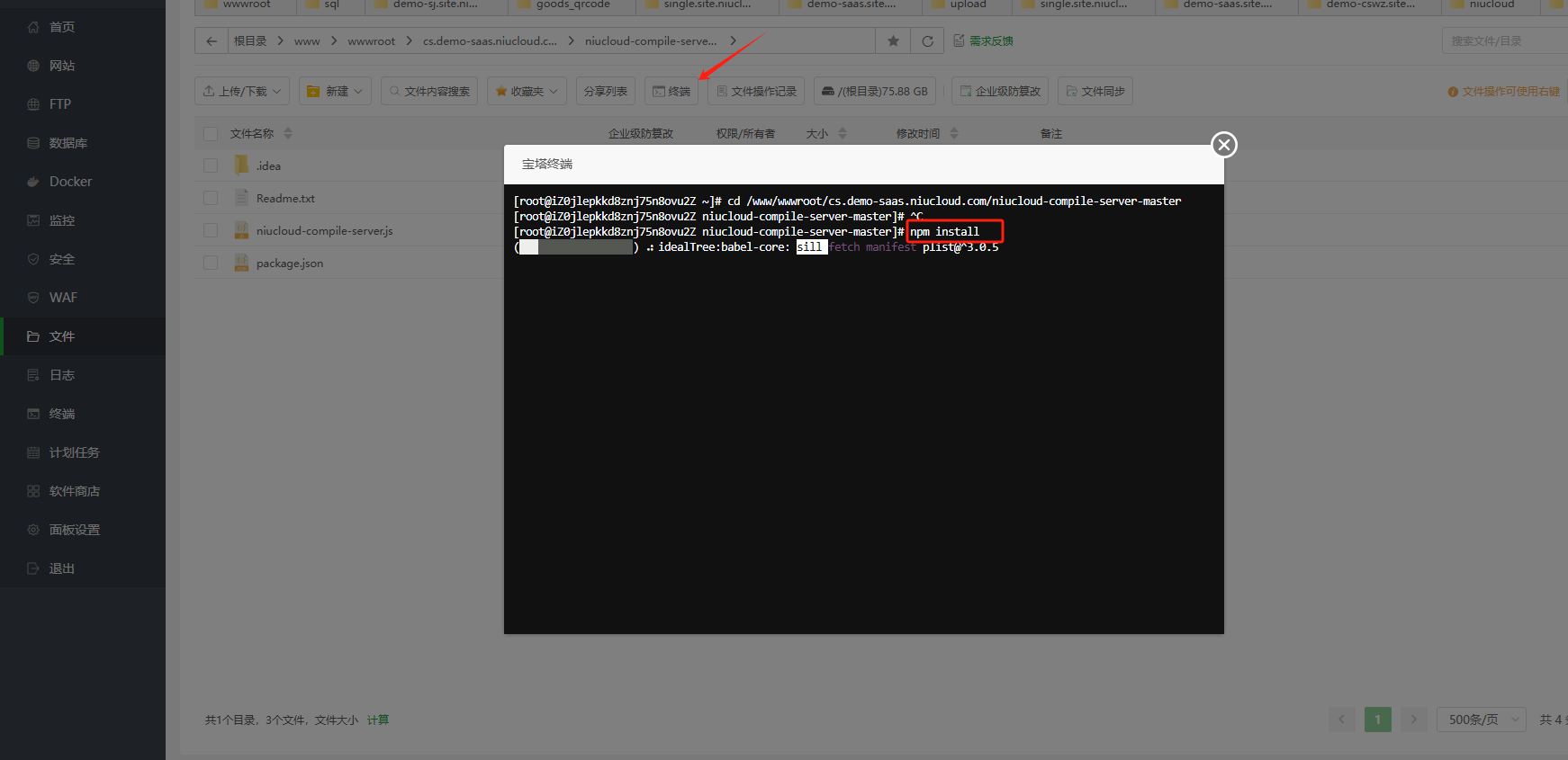 3.将下载好的程序包上传并解压到服务器,打开niucloud-compile-server-master,点击终端