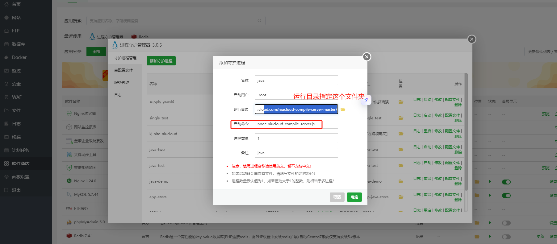 1.2进程名称必须为英文,用户默认root,启动命令为node niucloud-compile-server.js