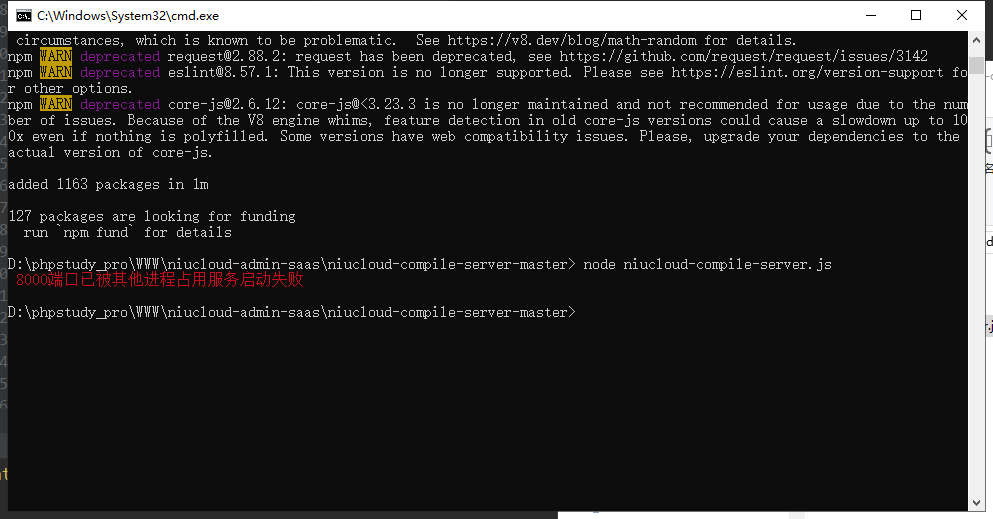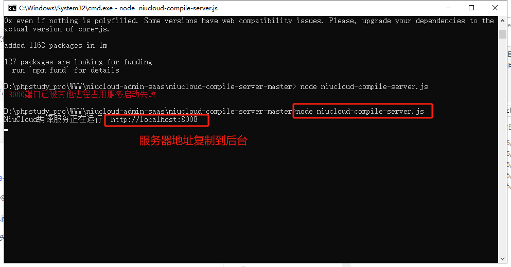 注意:如果启动node niucloud-compile-server.js命令时出现xxxx端口已被其他进程占用服务启动失败,(如下图)继续阅读下文,如果没有直接阅读第7点即可
