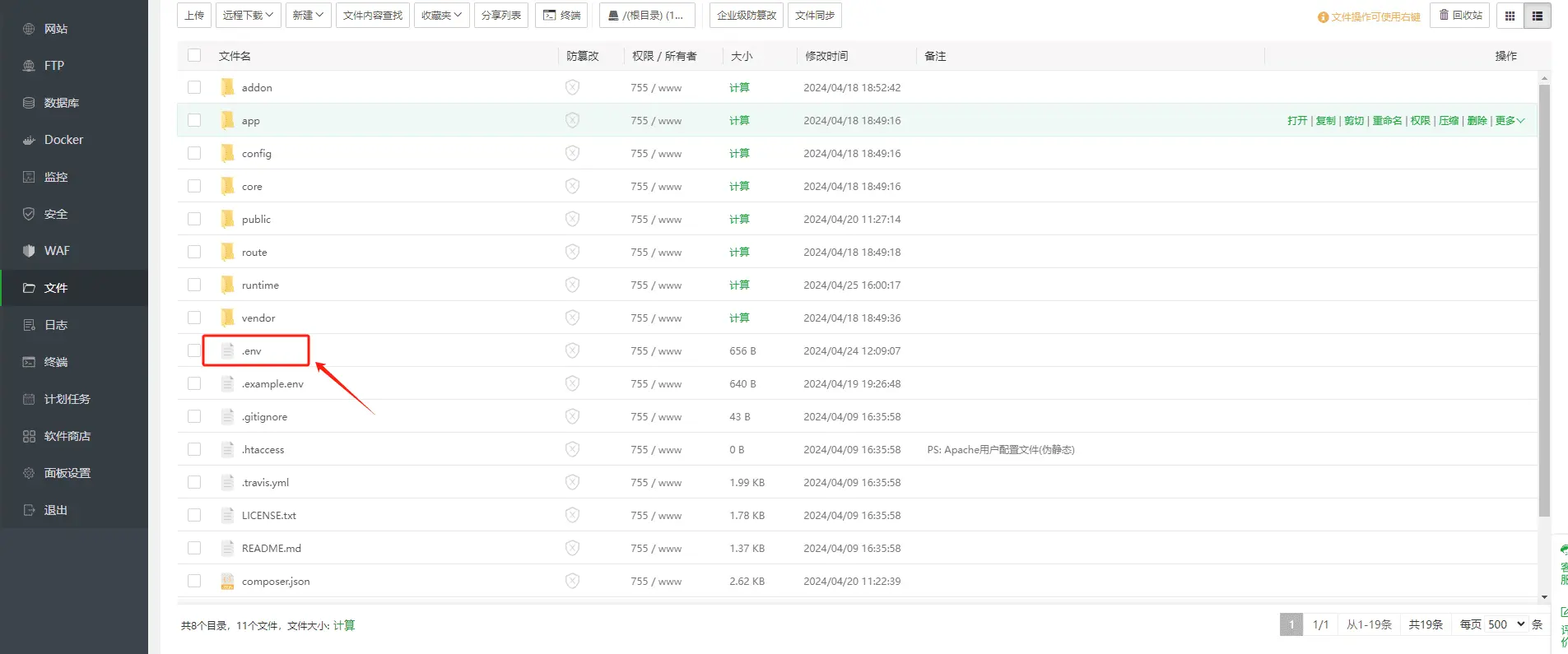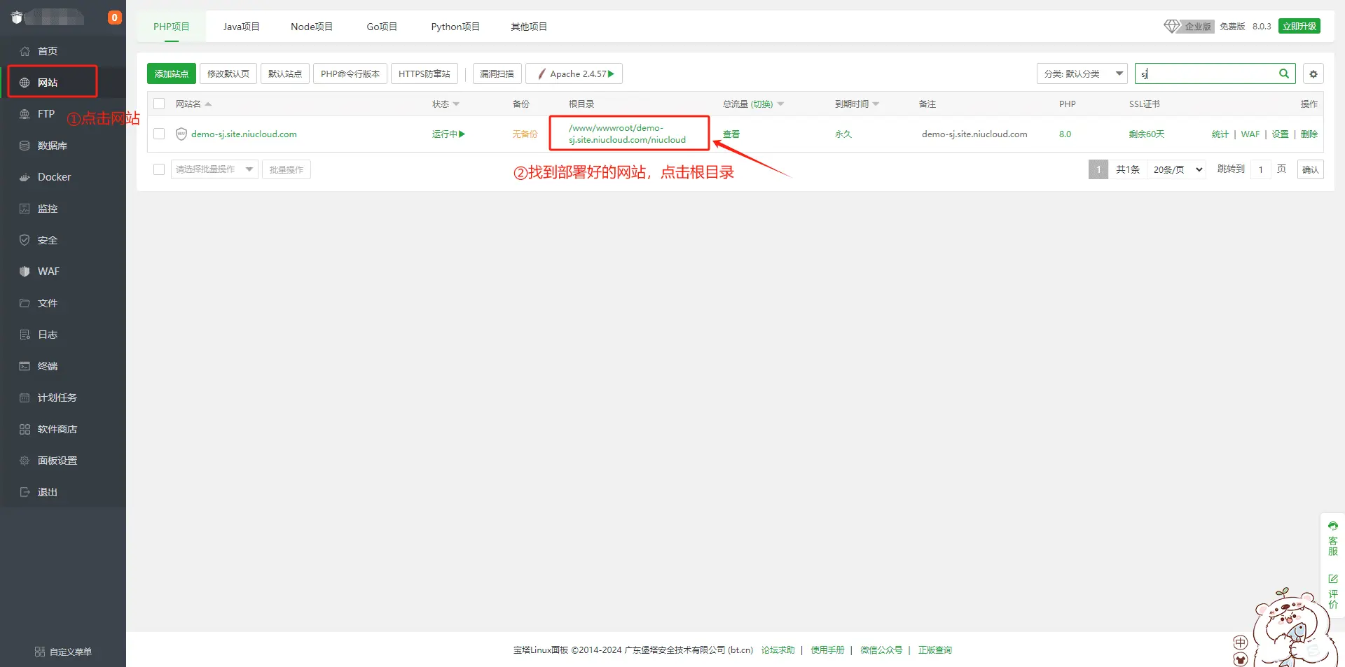 打开宝塔,点击网站,找到部署好的网站,点击根目录