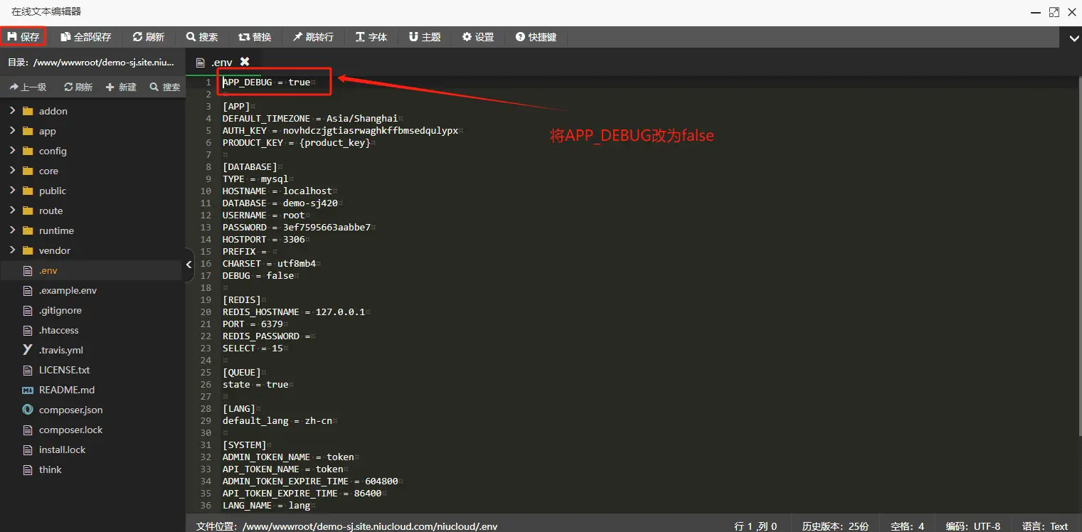 将 APP_DEBUG=true 改为 false(true 为显示,false 为不显示)