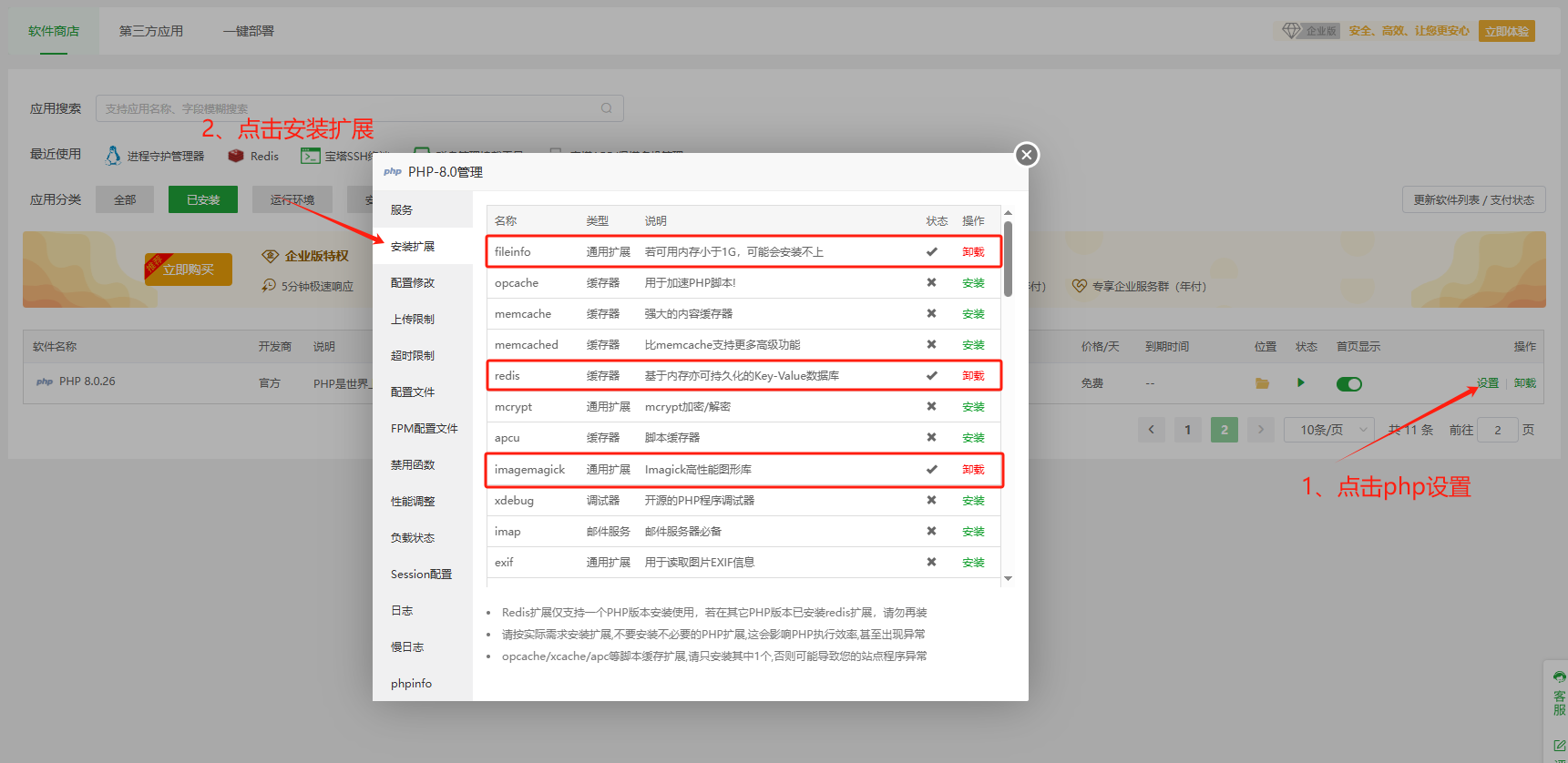 其中redis、fileinfo、imagemagick扩展在php的配置文件中开启